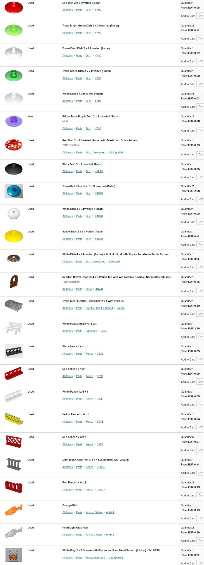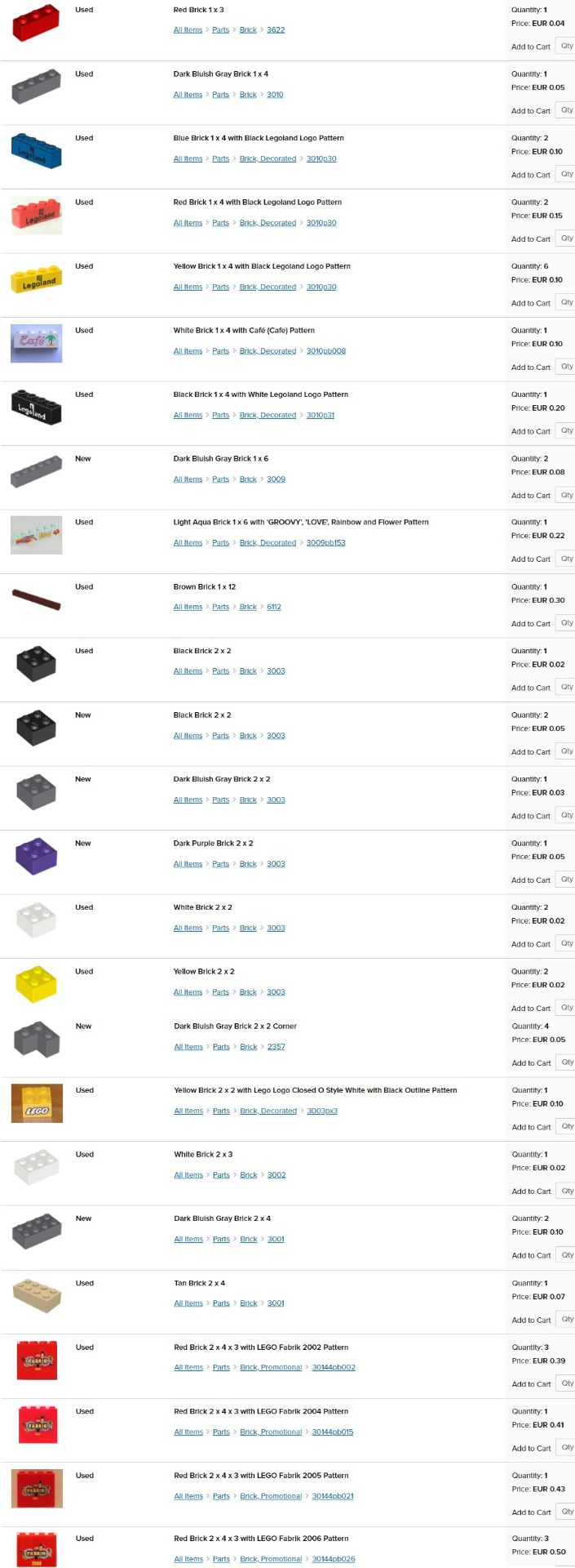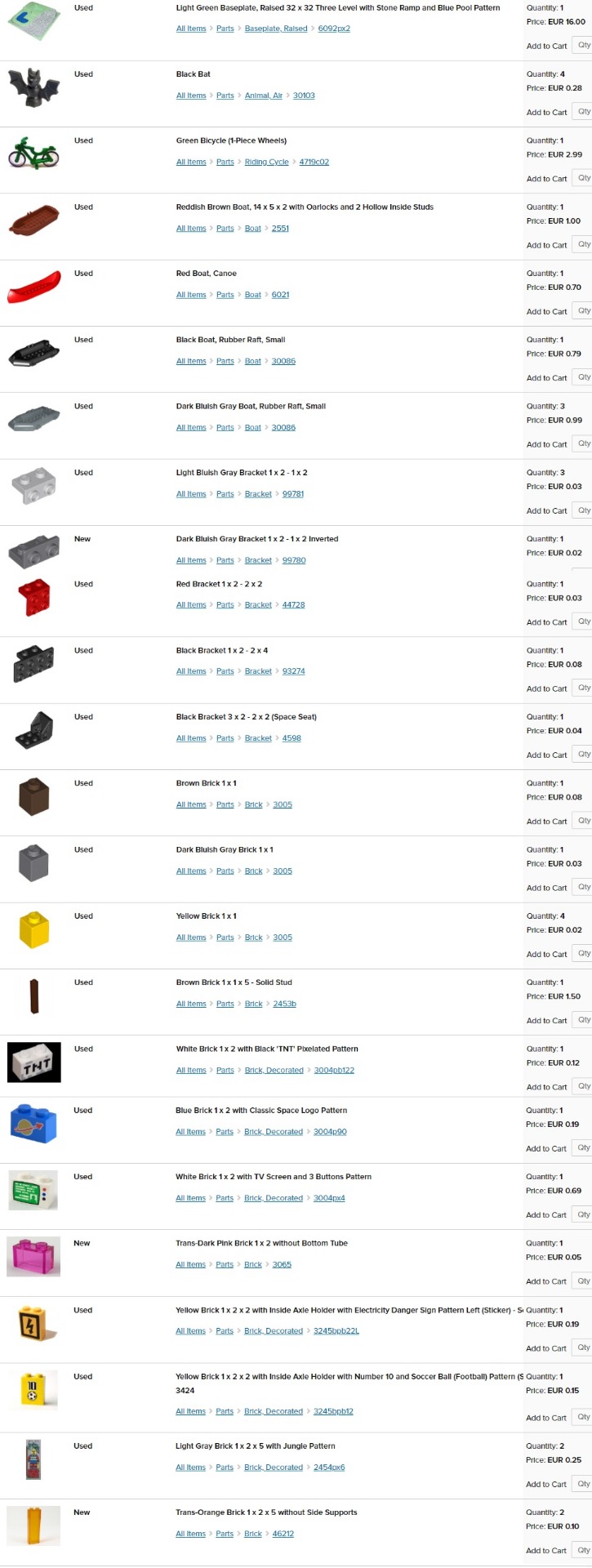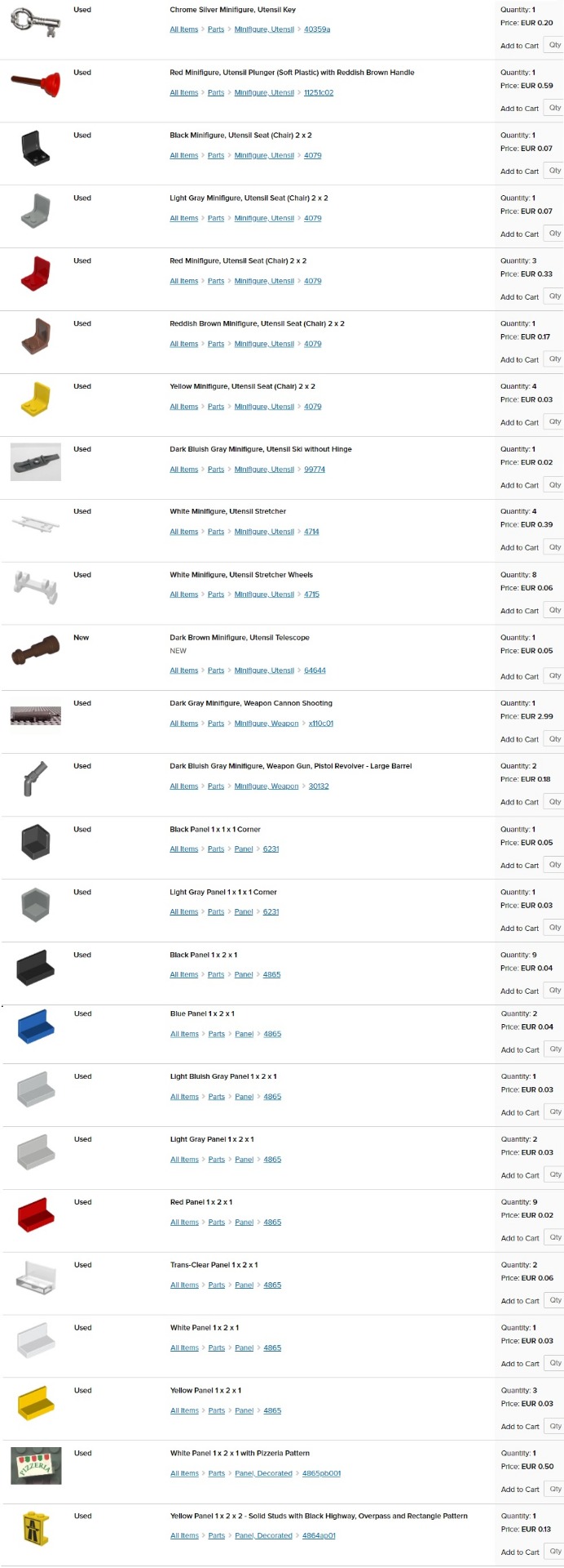 obrázok; stav - nové (new) alebo používané (used); názov dielika; dostupný počet kusov (quantity); cena za kus (price). Jednotlivé ceny sú platné len pre moje nižšie uvedené skladové zásoby (v ponuke aj mnoho ďalších dielikov na dopyt).