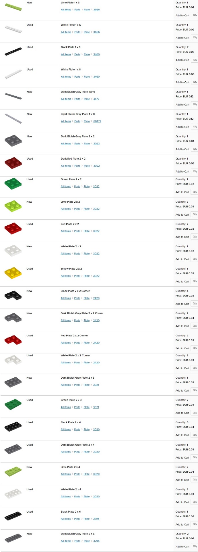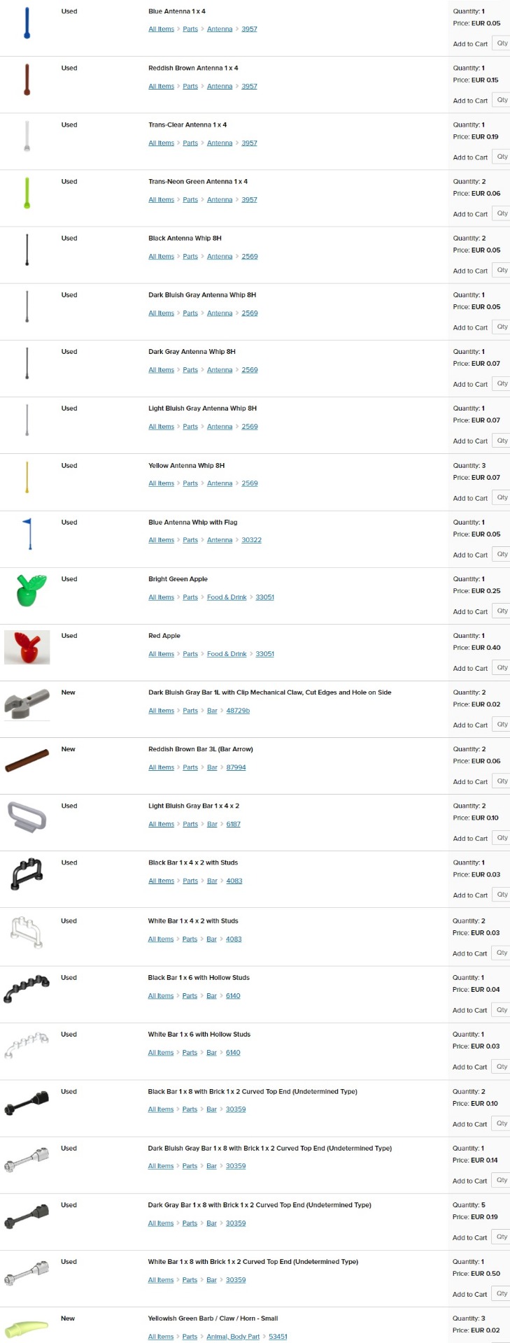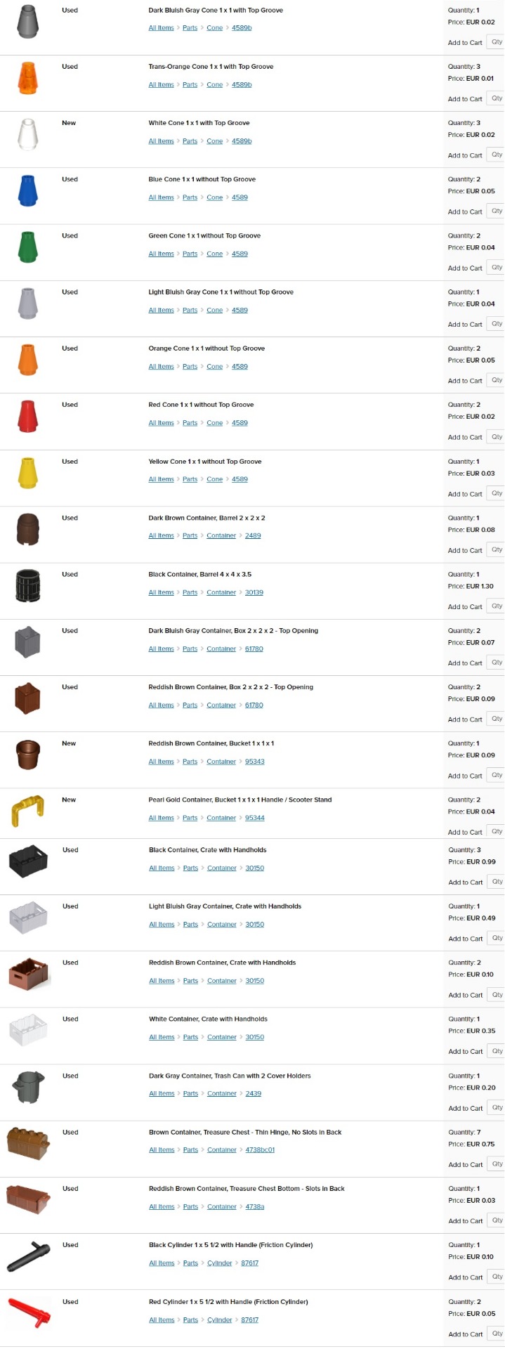 obrázok; stav - nové (new) alebo používané (used); názov dielika; dostupný počet kusov (quantity); cena za kus (price). Jednotlivé ceny sú platné len pre moje nižšie uvedené skladové zásoby (v ponuke aj mnoho ďalších dielikov na dopyt).
