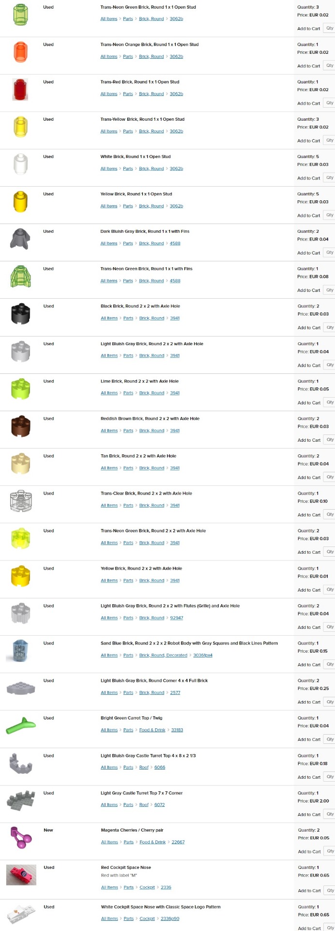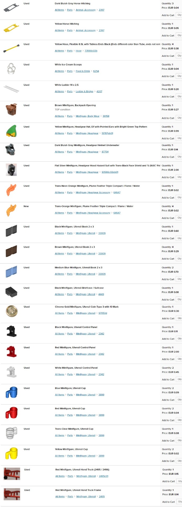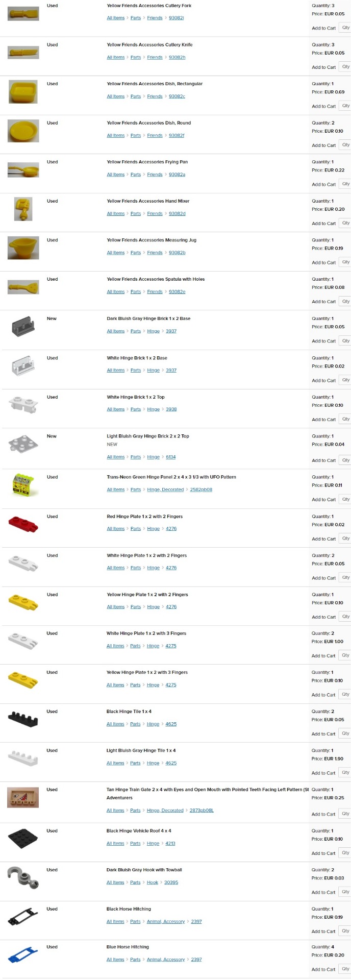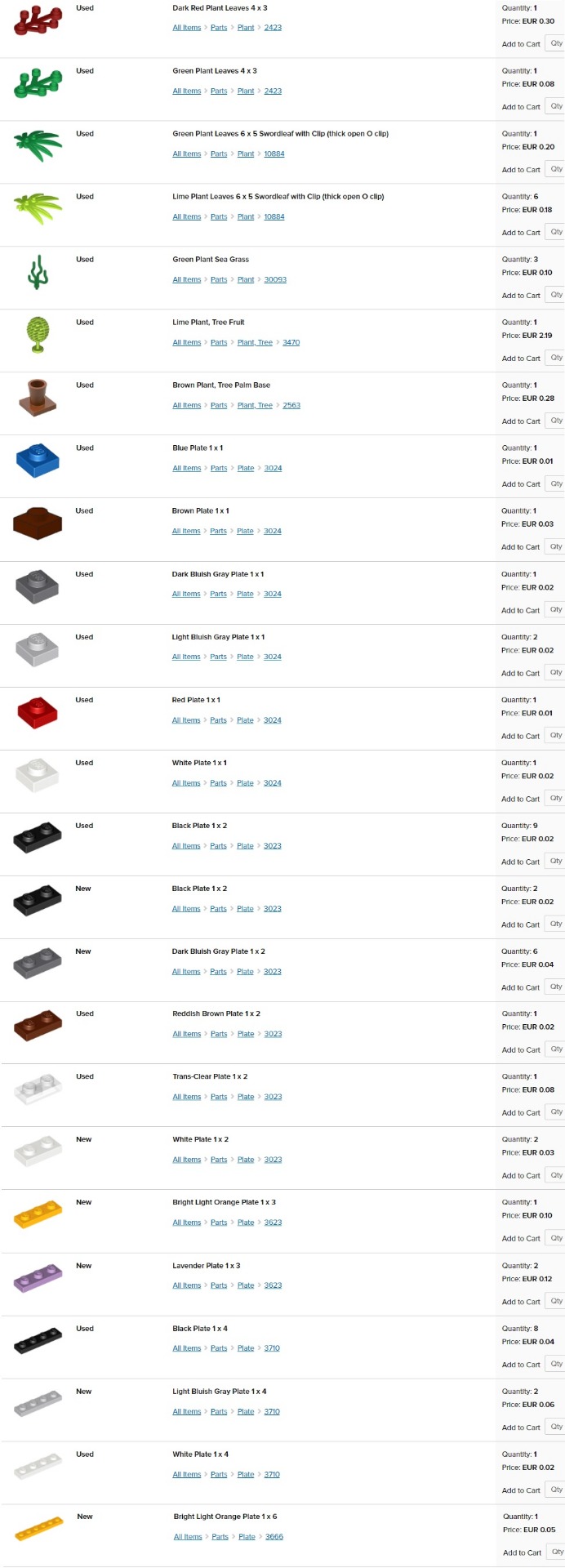 obrázok; stav - nové (new) alebo používané (used); názov dielika; dostupný počet kusov (quantity); cena za kus (price). Jednotlivé ceny sú platné len pre moje nižšie uvedené skladové zásoby (v ponuke aj mnoho ďalších dielikov na dopyt).